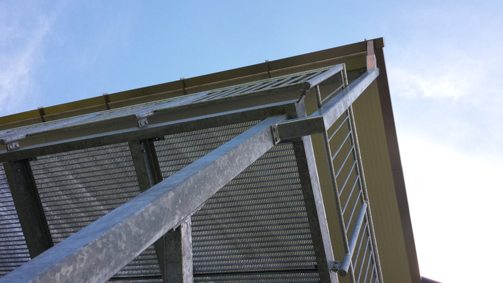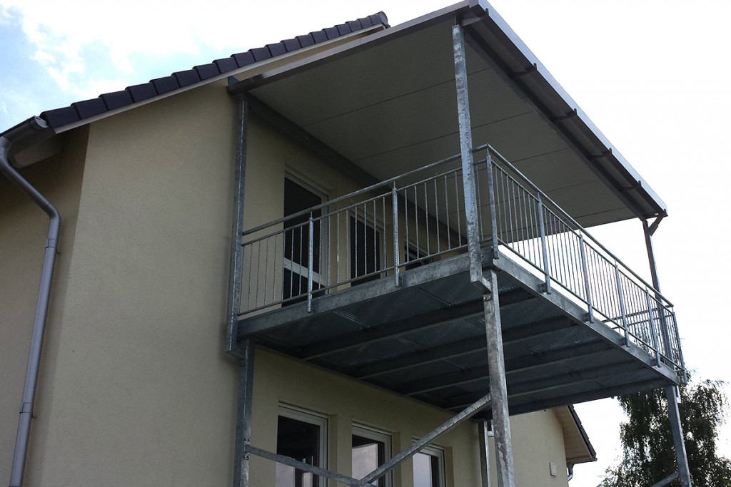 Balkonanlage in verzinkter Ausführung. Die Plattform ist aus einem umlaufenden Rahmen mit zwischendrin gespannten IPE-Trägern, die Stützen für die Plattform als auch für die Überdachung bestehen aus Vierkantrohren. Als Bodenbelag sind Gitterroste verbaut.