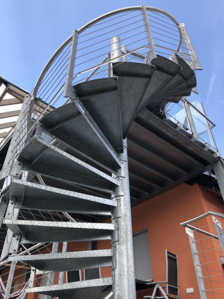 Außerdem wurden wir mit der Fertigung einer Spindeltreppe und diverser Geländer/Absturzsicherungen beauftragt. Die Spindeltreppe erhielt gekantetes Tränenblech als Treppenbelag. Das Balkon- sowie Treppengeländer stellen eine Stahl-Edelstahl-Kombination dar. Die Füllung der Geländer erfolgte mit waagerecht angeordneten Edelstahlseilen.