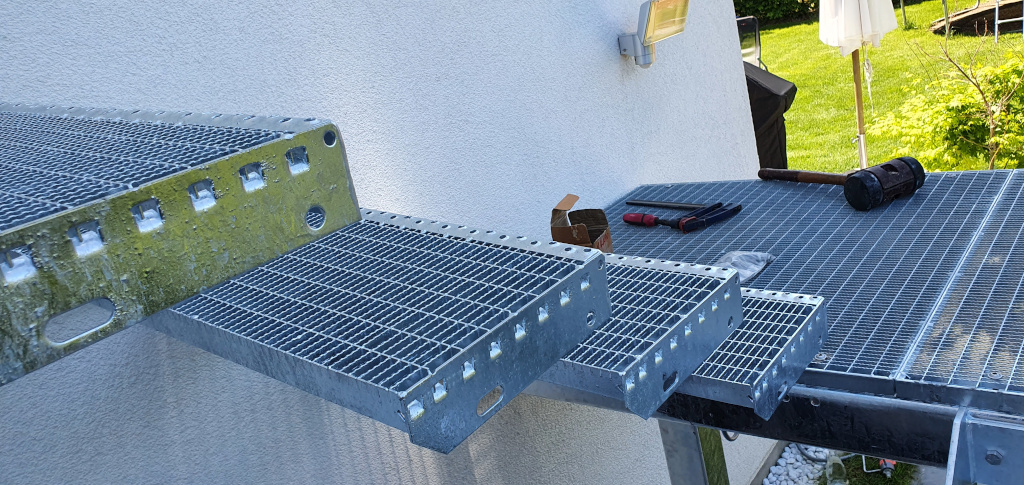 Der Treppenturm erhielt einen rutschhemmenden Gitterrostbelag mit Sicherheitsantrittskante und der Balkon die langlebigen Keramikfliesen.