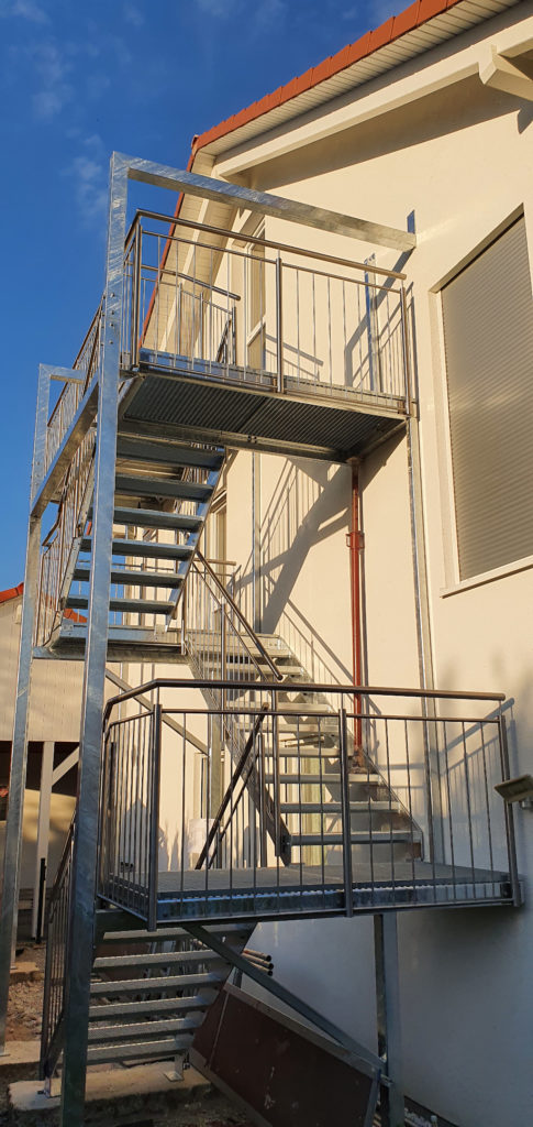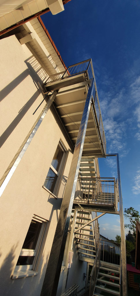 Die Treppen- sowie Balkonunterkonstruktion sind in feuerverzinkter Ausführung. Das Geländer mit senkrecht angeordneten Rundstäben ist in Edelstahl ausgeführt.